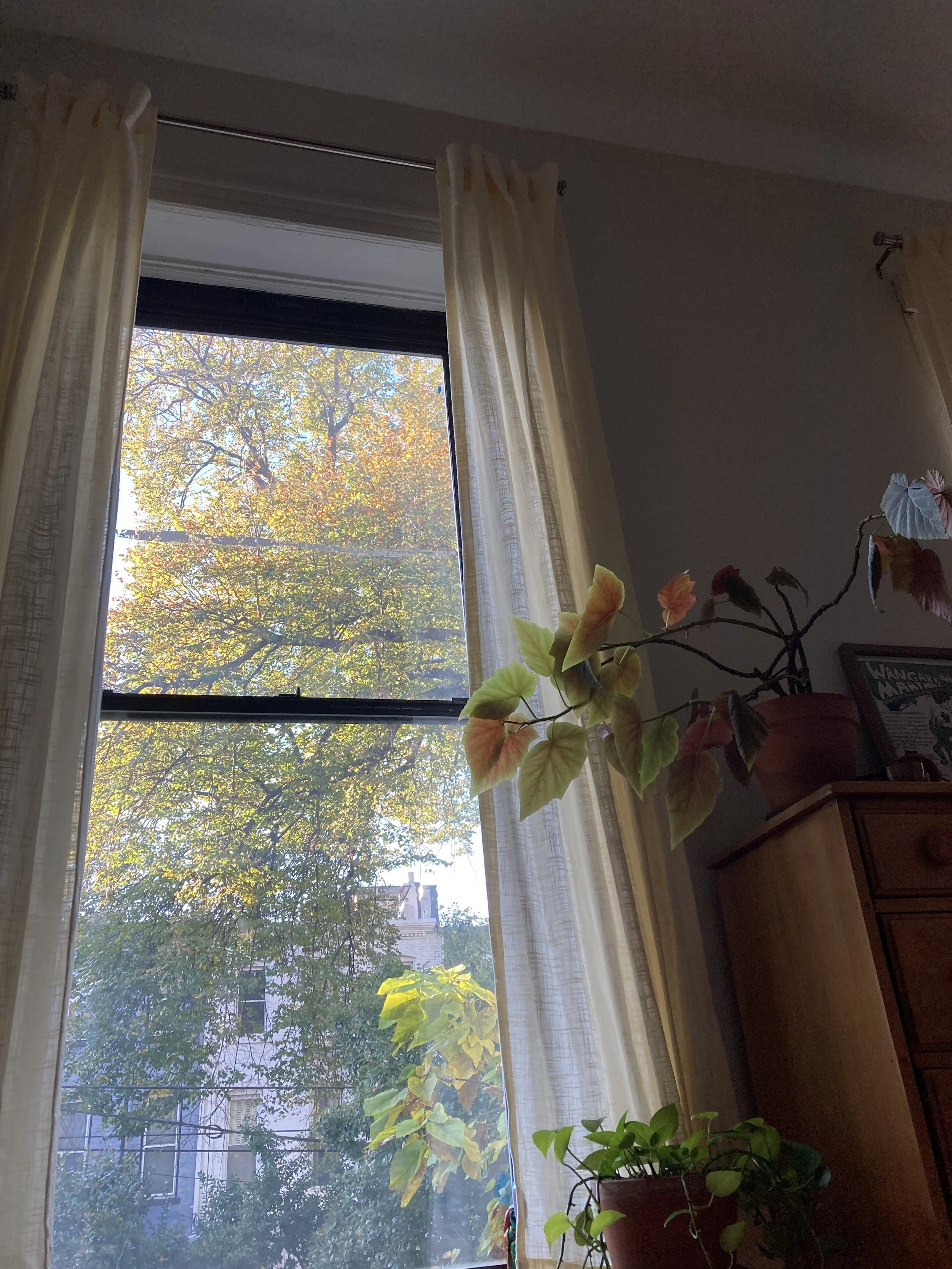 Mornin. No contact lenses and no glasses on, so I only see shapes. I see the morning light on the leaves of the tree out my window, and I said to myself, βThe morning light on leaves.β Sometimes this is the first thing I see in the morning. Sometimes this is the first thing I think in the morning. This joy, the sun on leaves, has been prolonged, growing steadily day by day, to the oncoming death of winter.